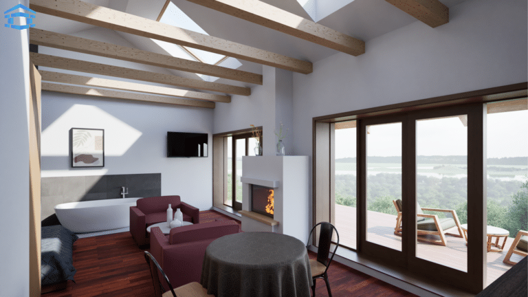 - Nyitott, multifunkciós belső tér: A 43 m²-es faház egybenyitott nappali-háló-konyha kialakítással maximálisan kihasználja a rendelkezésre álló területet, miközben tágas és légies érzetet kelt.